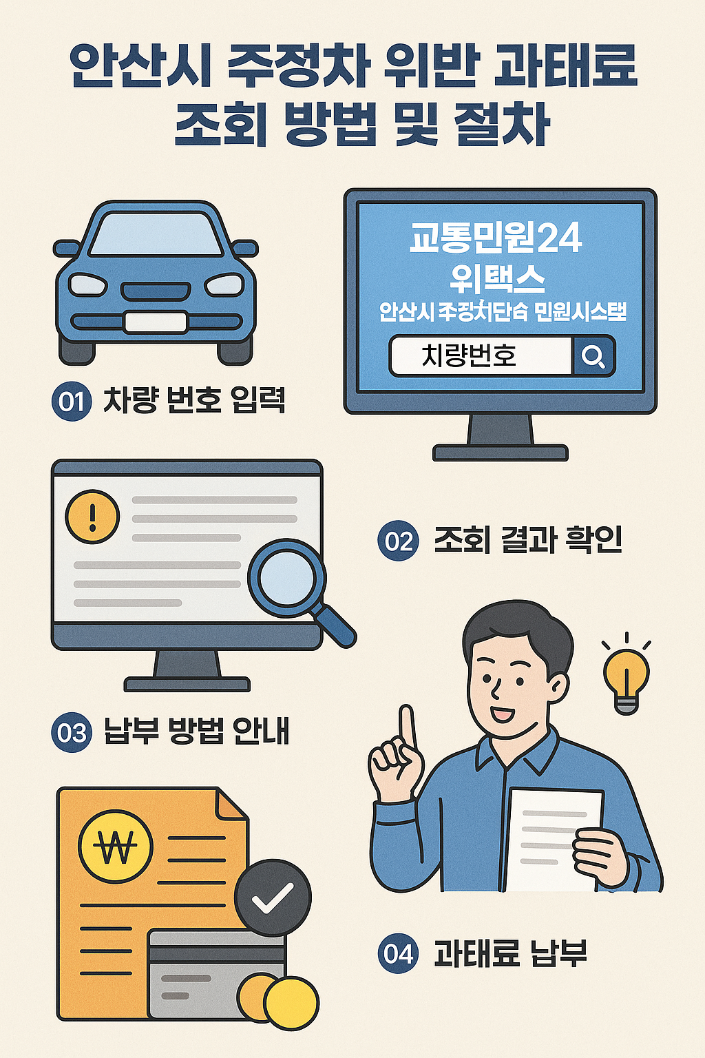 안산시 주정차 위반 과태료 조회는 교통민원24, 위택스, 안산시 주정차단속 민원시스템 등 다양한 경로를 통해 간편하게 할 수 있습니다.