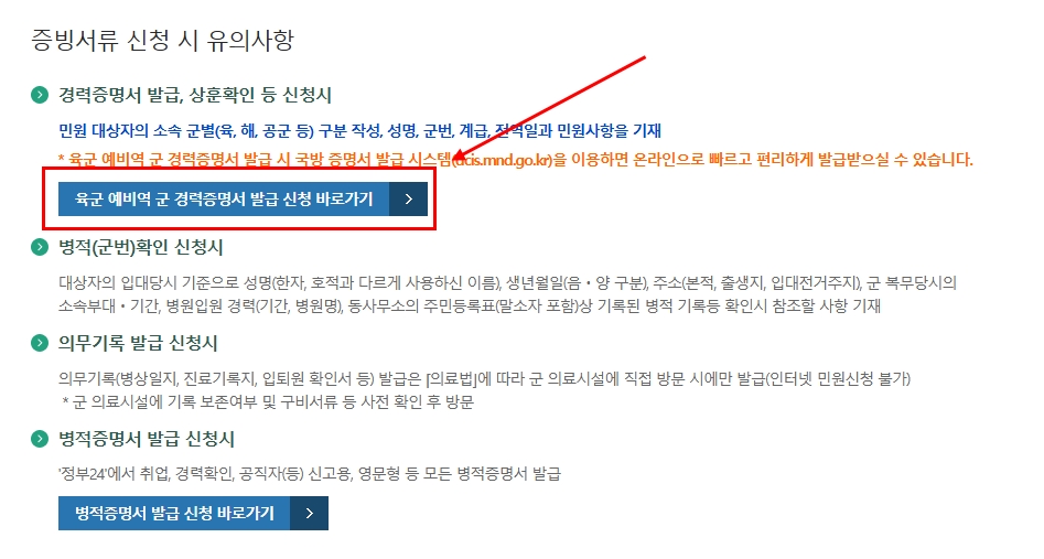 - ‘군경력증명서’ 또는 ‘경력증명’ 메뉴 선택