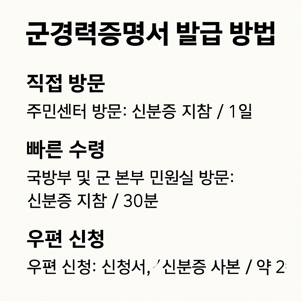 | 주민센터 | 직접 방문 | 3시간 이내 | 신분증, 군 정보 | 팩스 송부 방식 |