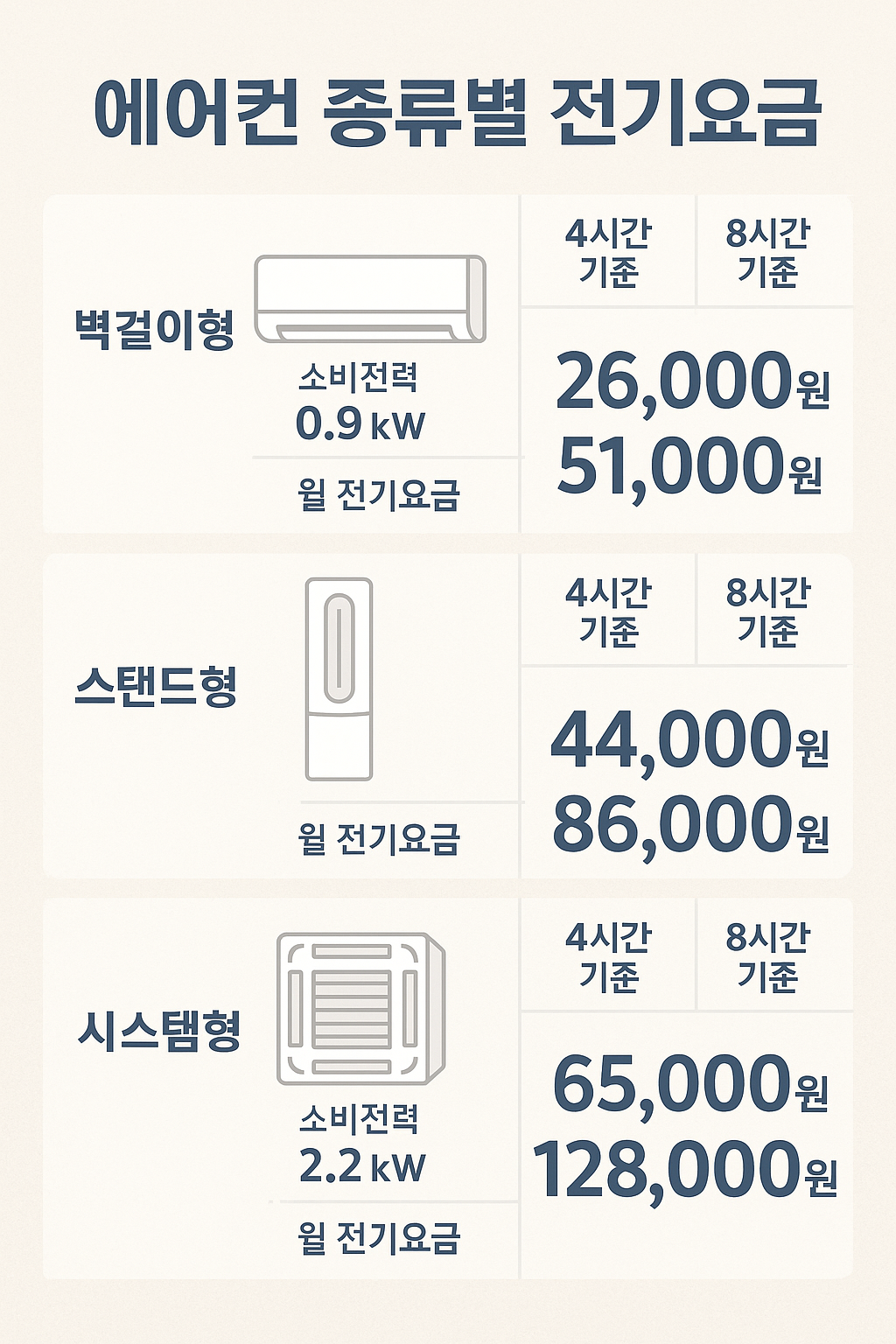에어컨 종류와 사용 시간에 따른 전기요금